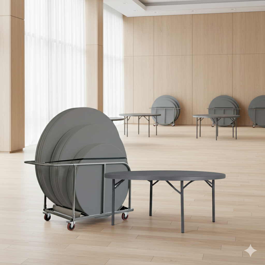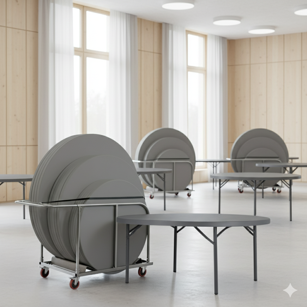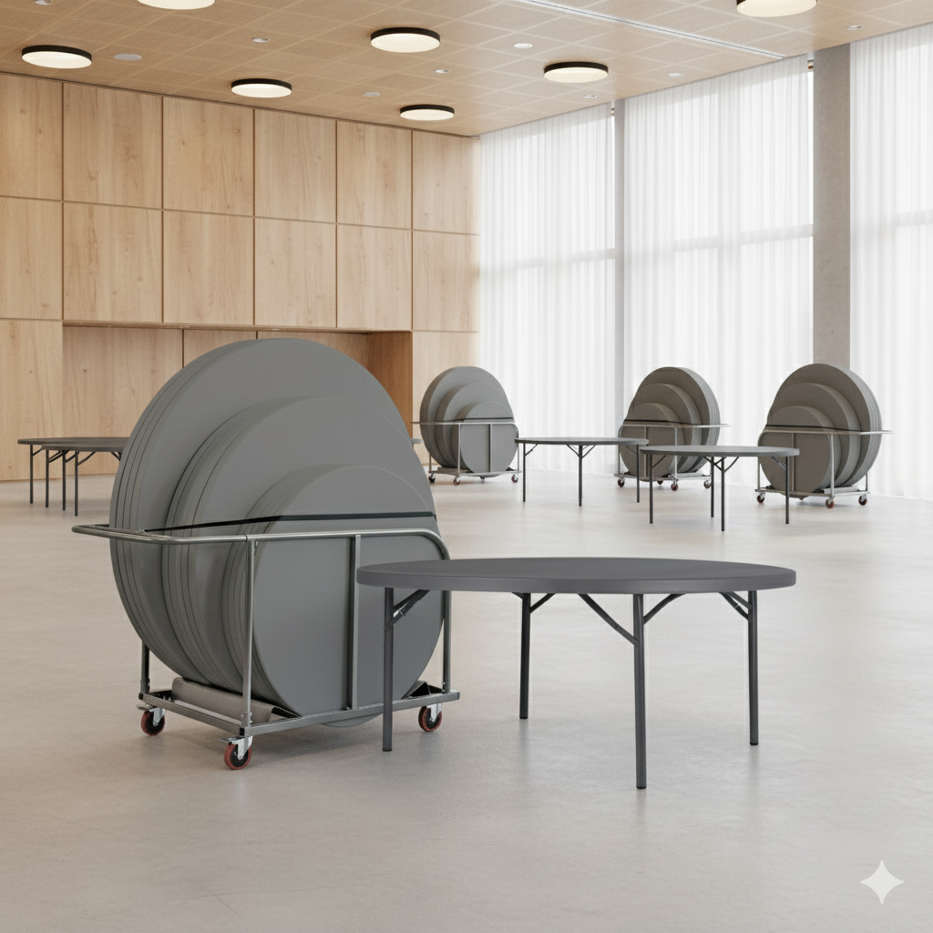 Få maksimal kapacitet og effektiv håndtering med denne komplette løsning, der indeholder 12 store Zown Planet klapborde med en diameter på 180 cm samt en gratis bordvogn specialdesignet til runde borde. Ideel til banketter, konferencer, hoteller og festlokaler, hvor både æstetik, robusthed og logistik er i højsædet.