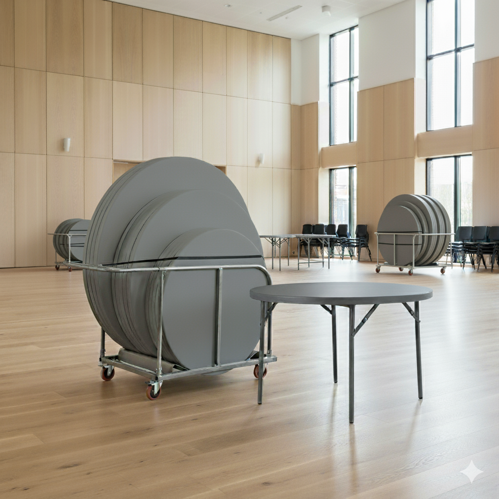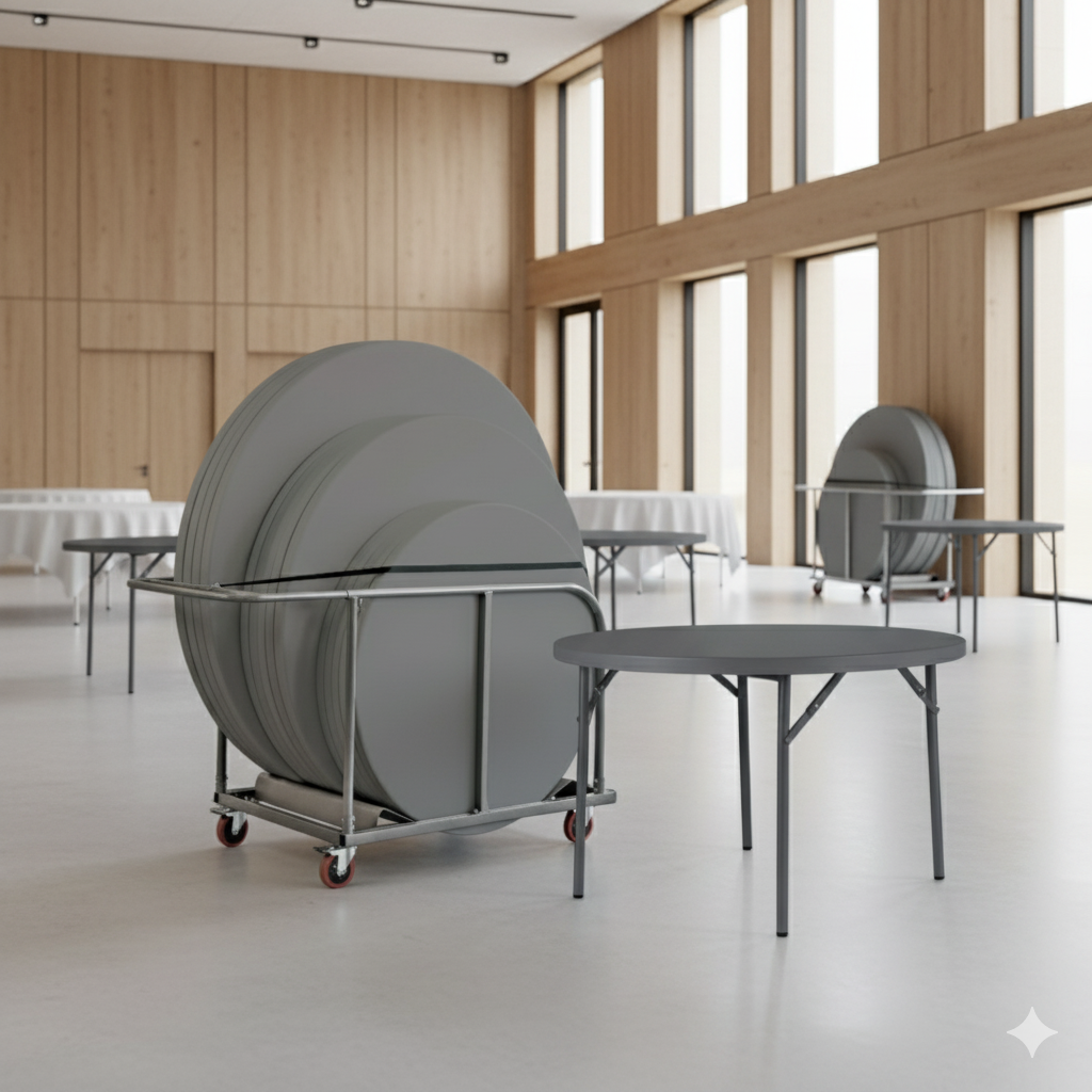 Gør opbevaring og opsætning let og professionel med denne sampakke, som består af 15 Zown Planet runde klapborde med diameter på 120 cm og en gratis specialdesignet bordvogn til nem transport og pladsbesparende opbevaring. Perfekt til fester, konferencer, hoteller og udlejning, hvor både æstetik og funktionalitet er vigtig.