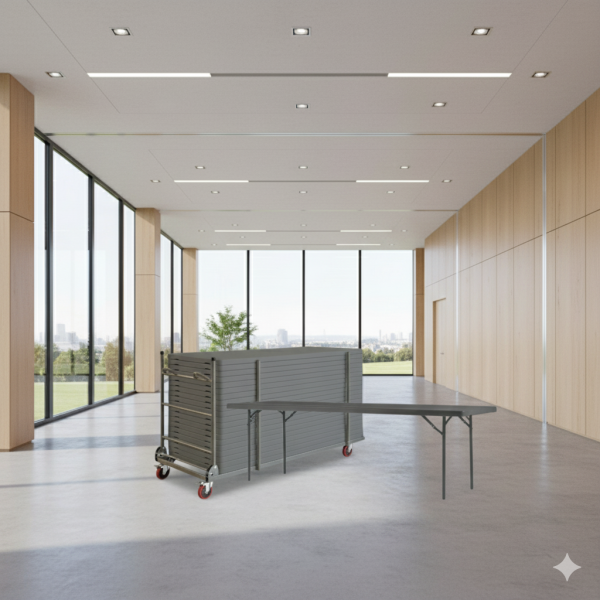 Få maksimal bordplads og minimal besvær med denne gennemførte pakkeløsning, der indeholder 18 Zown New Classic klapborde i 240×76 samt en gratis bordvogn med kapacitet til 18 borde. Perfekt til større events, konferencer, kantiner og udlejning, hvor der stilles høje krav til både funktionalitet og kvalitet.