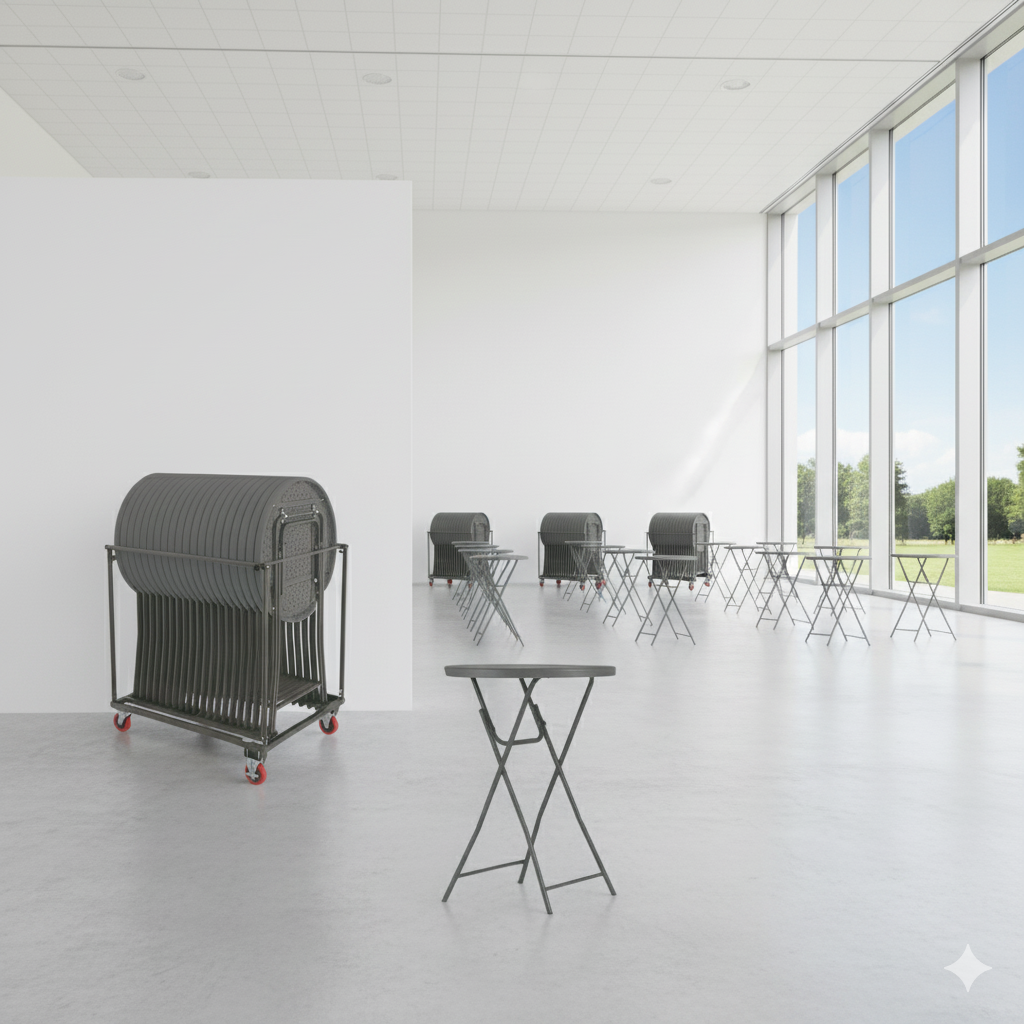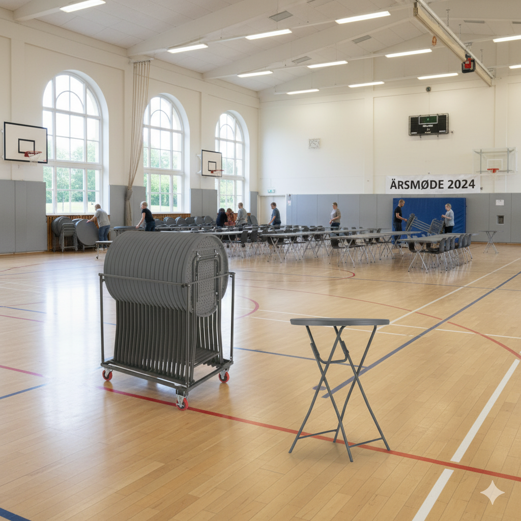 - Effektiv bordvogn inkluderet: Den medfølgende bordvogn har plads til alle 20 borde og gør det nemt at flytte og opbevare dem – en stor fordel ved hurtige op- og nedmonteringer.
