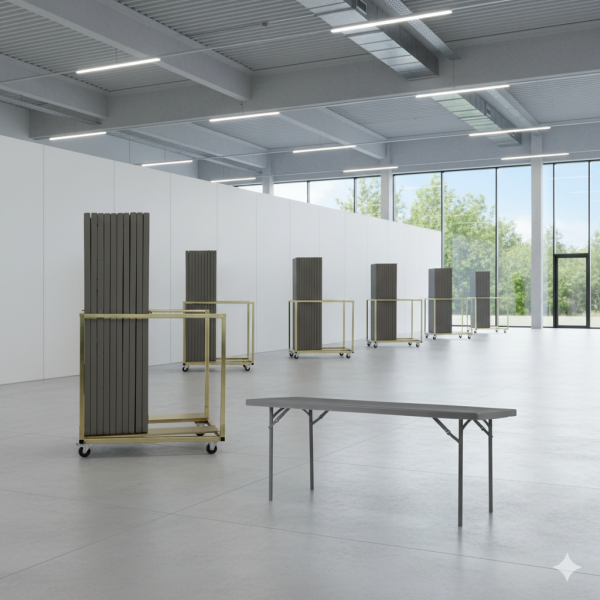 - Pladsbesparende og mobil løsning: Når bordene ikke er i brug, kan de let foldes sammen og opbevares på den medfølgende bordvogn, som rummer alle 21 borde. Det sparer både plads og tid – ideelt til miljøer med hyppig opstilling og nedtagning.