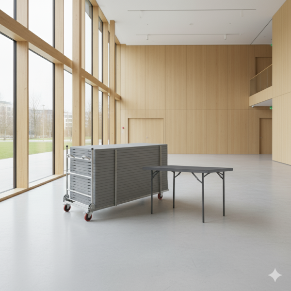 Gratis bordvogn inkluderet: Med plads til op til 24 borde gør vognen det nemt at flytte og opbevare bordene – ideel til hurtig opsætning og nedtagning.
