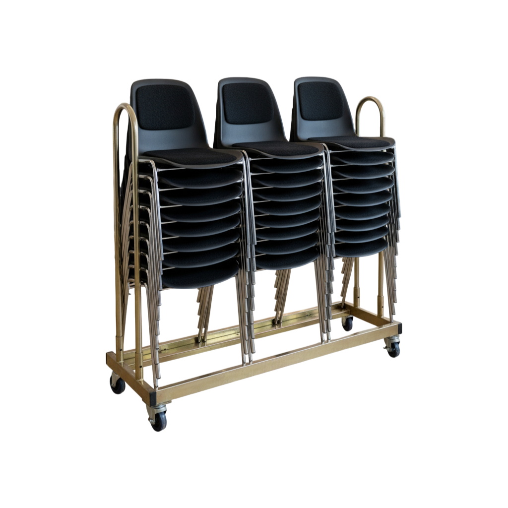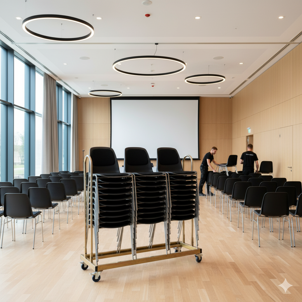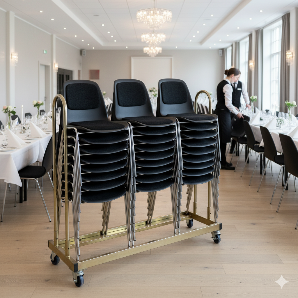 - Effektiv stolevogn inkluderet: Den medfølgende vogn rummer op til 30 stole og gør transport og opbevaring let og effektiv – perfekt til hurtig opsætning og nedtagning.