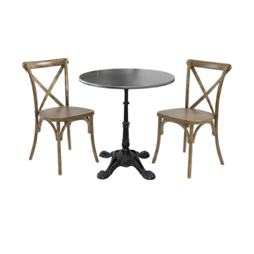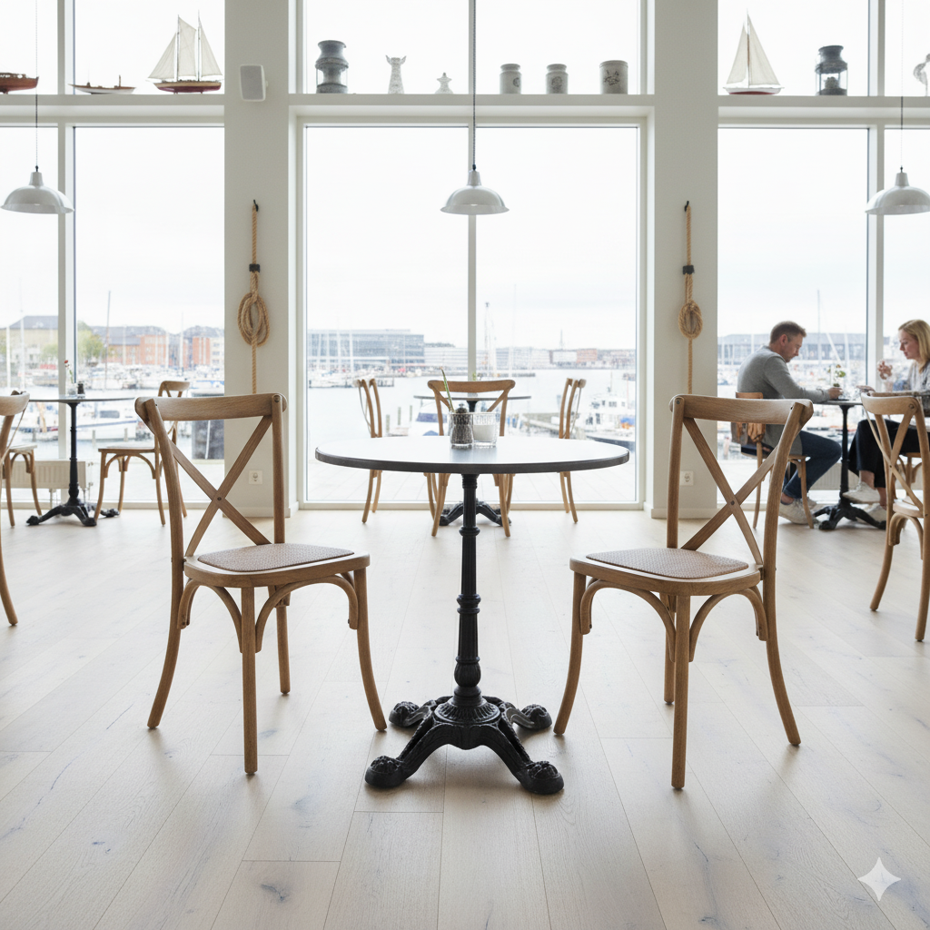 Cafépakke med cafébord og 2 Crossback stole i plast – stilrent og professionelt valg