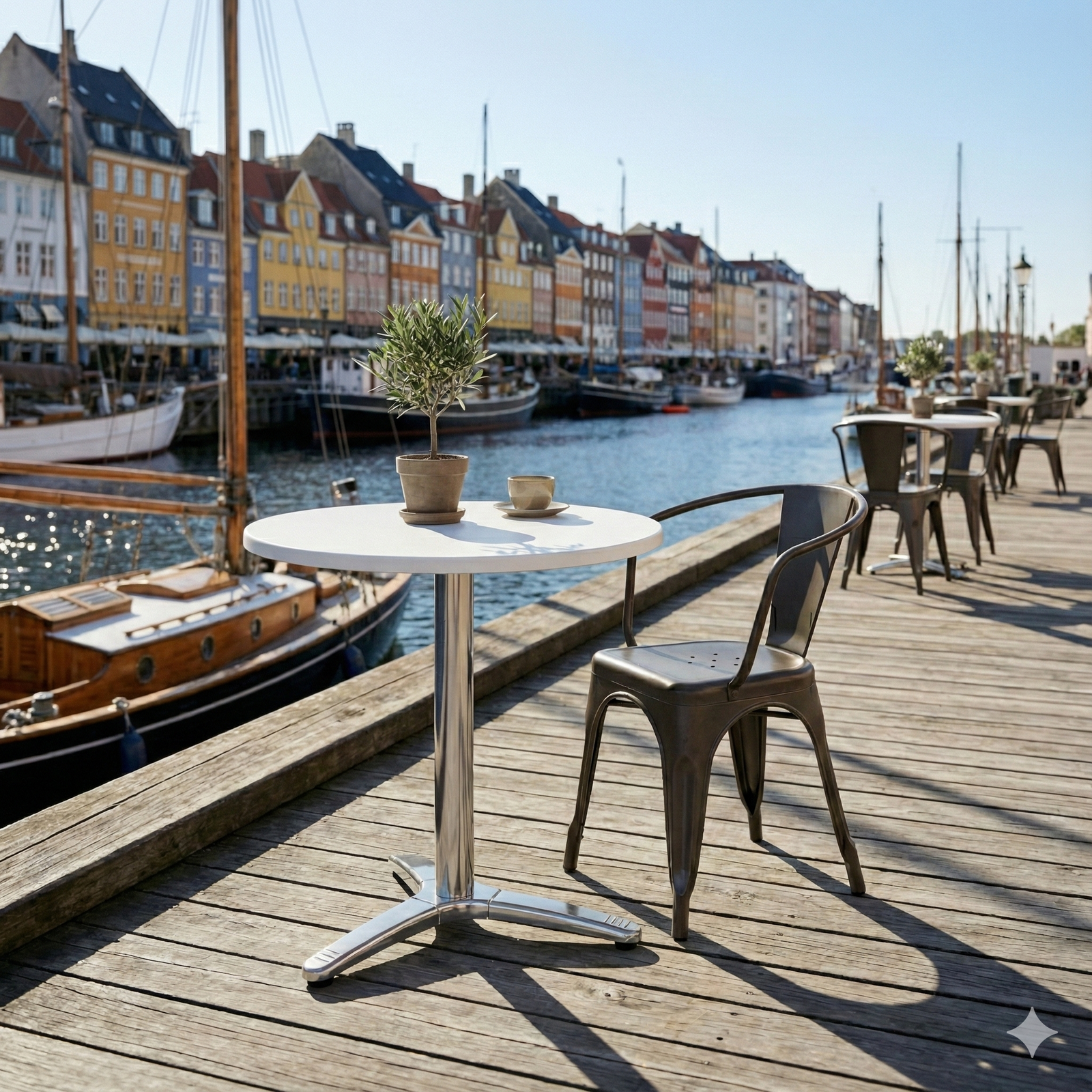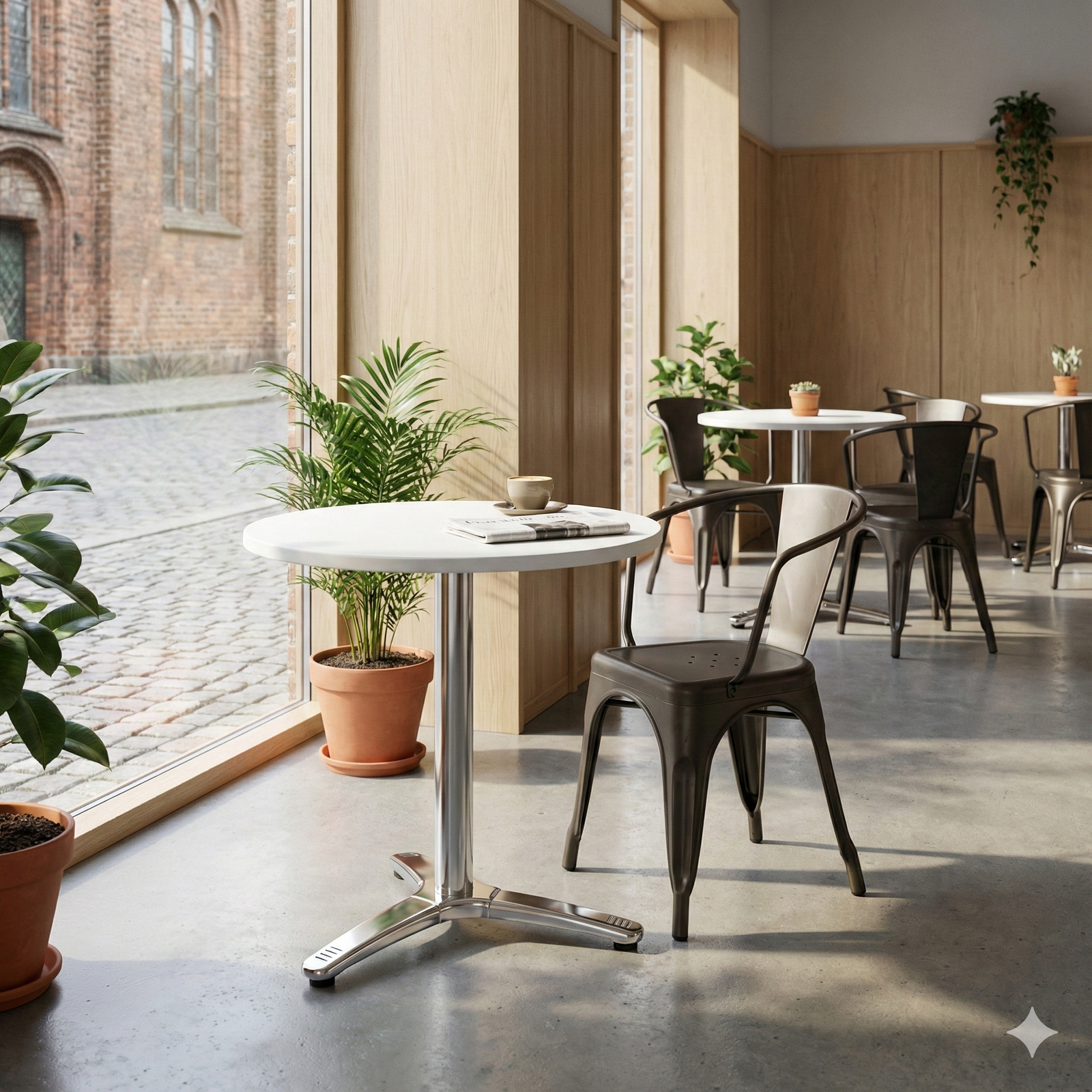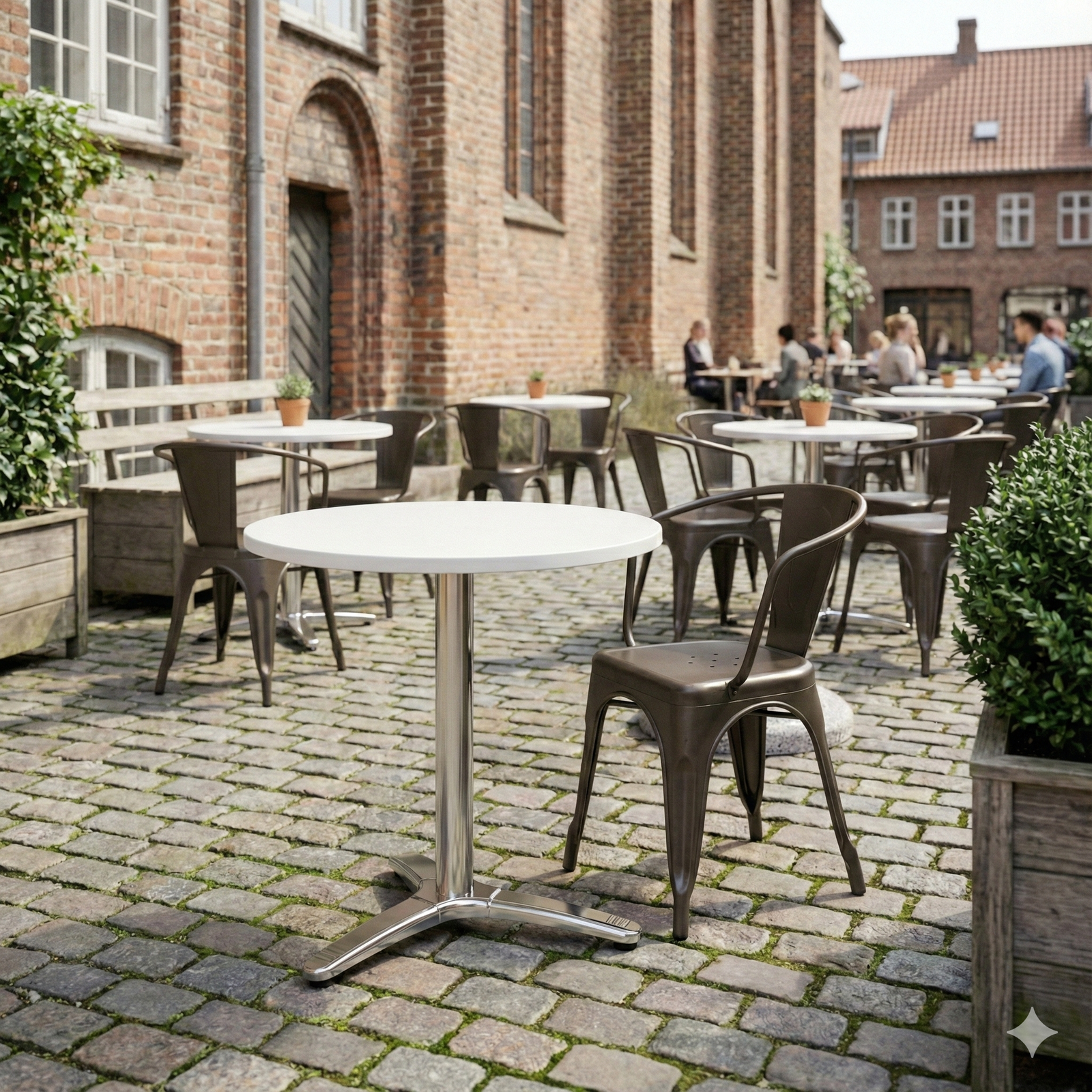 Den runde form understøtter en fleksibel bordopstilling og skaber en behagelig gæsteoplevelse, hvor pladsen udnyttes effektivt. En driftssikker løsning for professionelle indkøbere, der ønsker lav vedligeholdelse og et ensartet, lyst udtryk – både inde og ude.