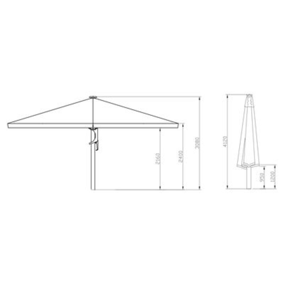 Kæmpeparasol med slidstærk dug af 300g/m2 polyester. Dugen har særdeles god farveægthed 4-5, som reducerer falmning på grund af sollys og ozon. Stangen er udført i kraftig hvidlakeret aluminium.