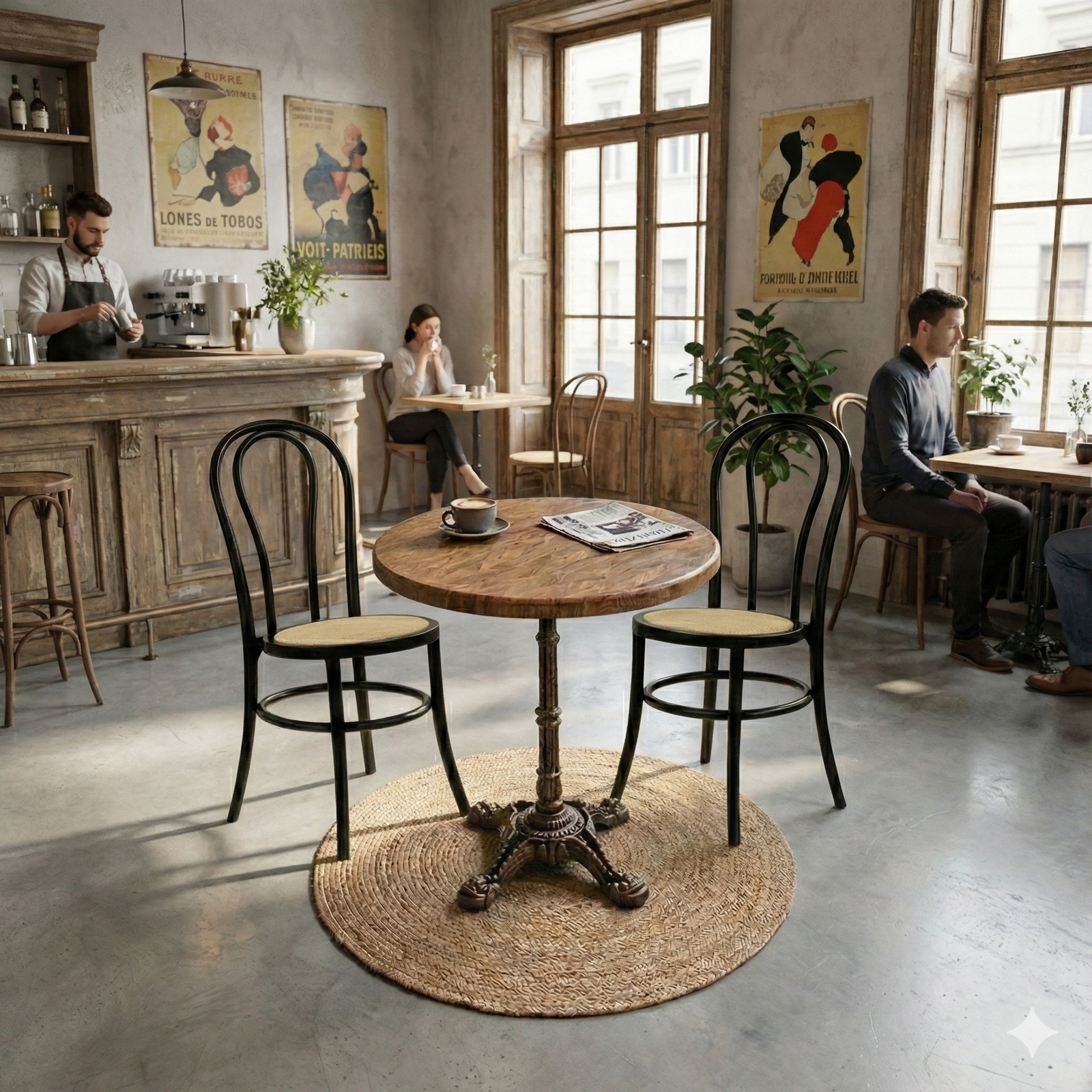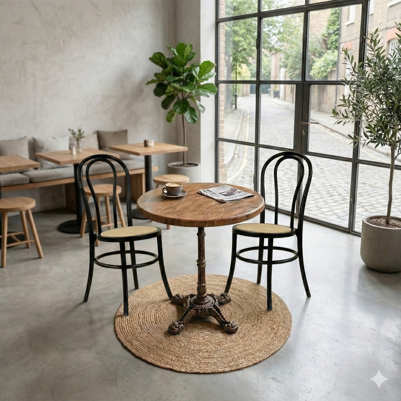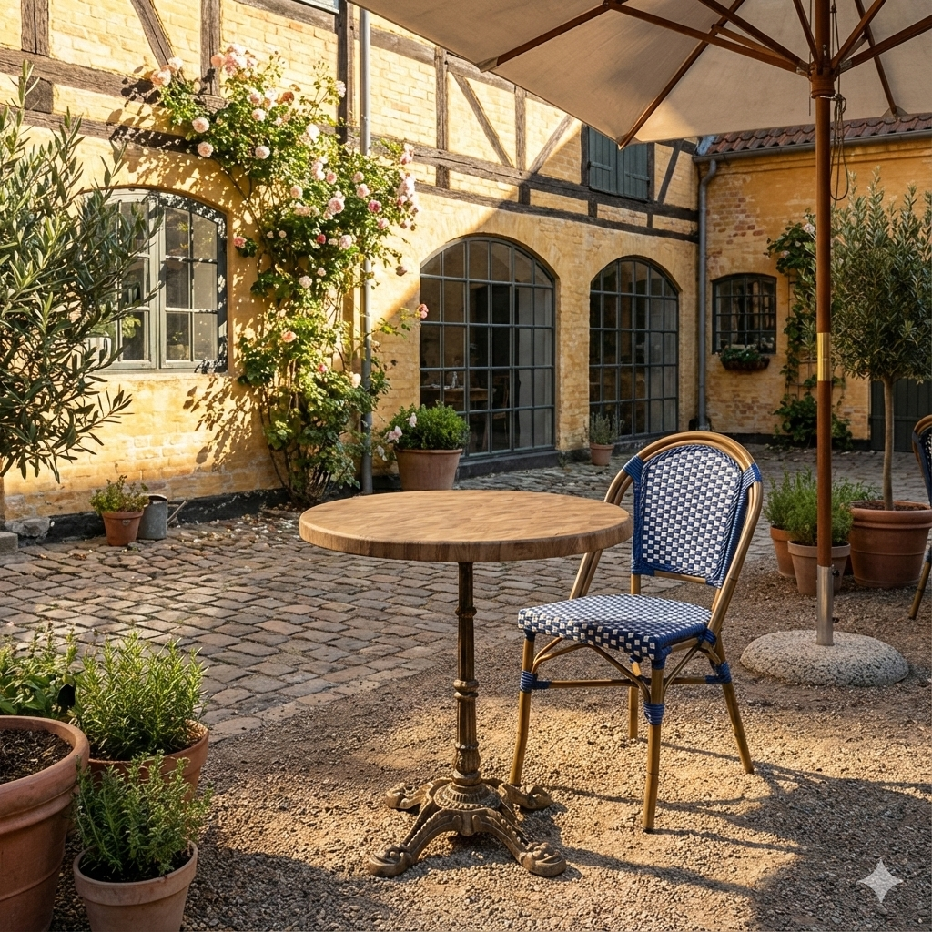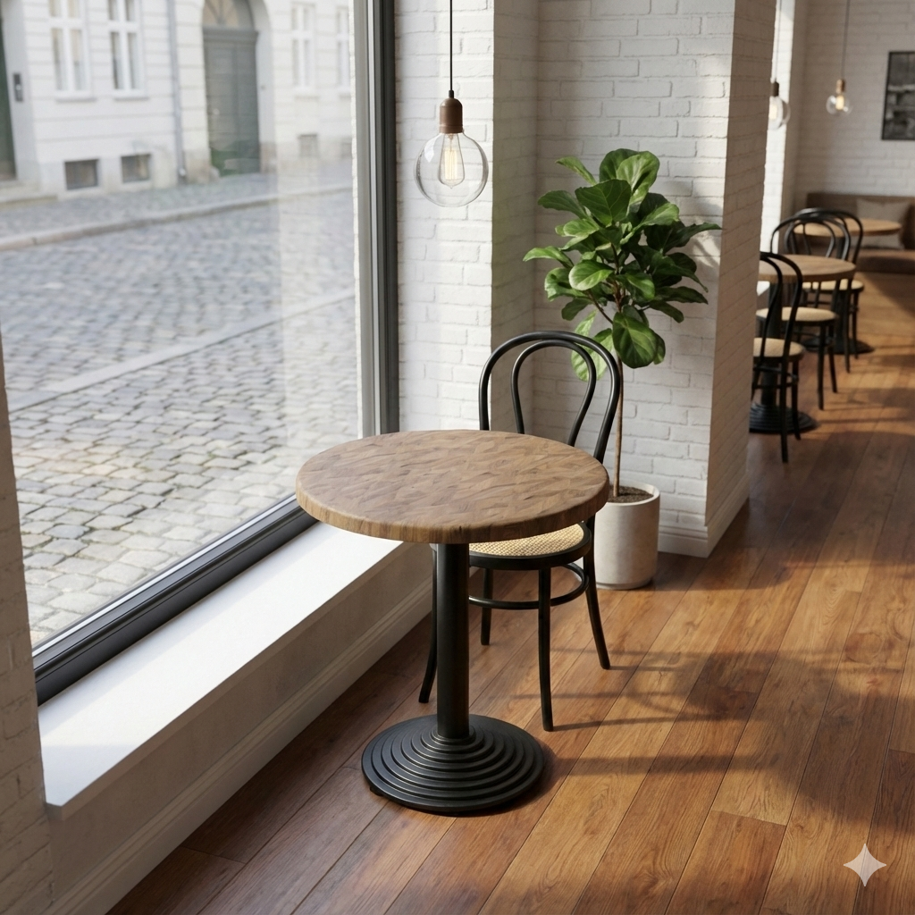 Den runde form understøtter en fleksibel og social bordopstilling, der bidrager til en behagelig gæsteoplevelse og effektiv udnyttelse af pladsen. En driftssikker løsning for professionelle, der ønsker et lyst trælook med lav vedligeholdelse og lang levetid – både indendørs og udendørs.