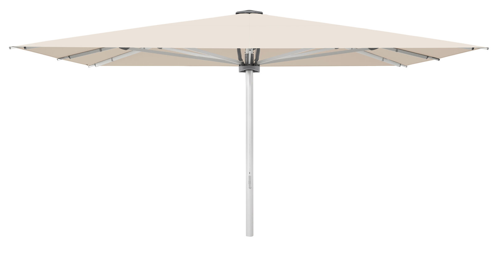 Palazzo Style 350×350 cm er enkel at åbne, så du hurtigt kan få ly for solen – med blot ni omdrejninger af håndtaget kan du nemt betjene parasollen, også over store, dækkede borde.