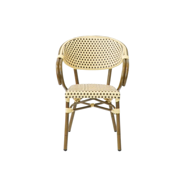 Opgrader dit udendørsområde med Paris caféstol med armlæn og flet, der forener høj kvalitet og elegant design. Stolen er ideel til caféer, hoteller, campingpladser og virksomheder, der ønsker at tilbyde deres gæster både komfort og et indbydende visuelt udtryk.