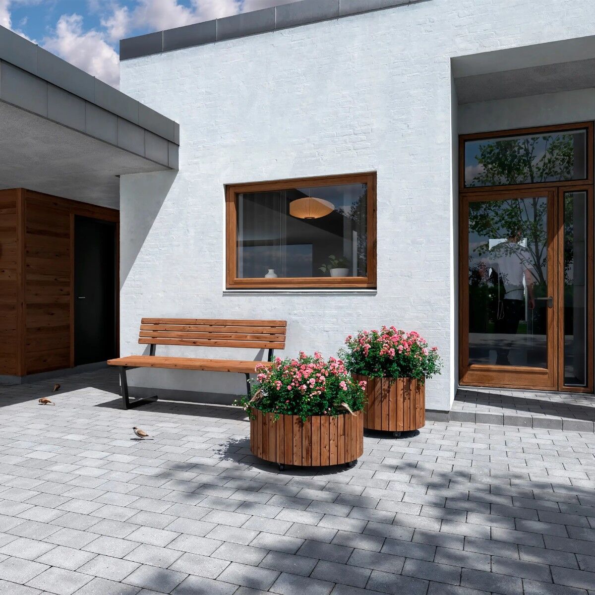 • Planker: 42×56 mm ThermoWood® (varmebehandlet fyrretræ), der er naturligt holdbart og kræver minimal vedligeholdelse. Træet patinerer smukt til en grå nuance over tid, men kan behandles med olie for at bevare den varme træfarve.