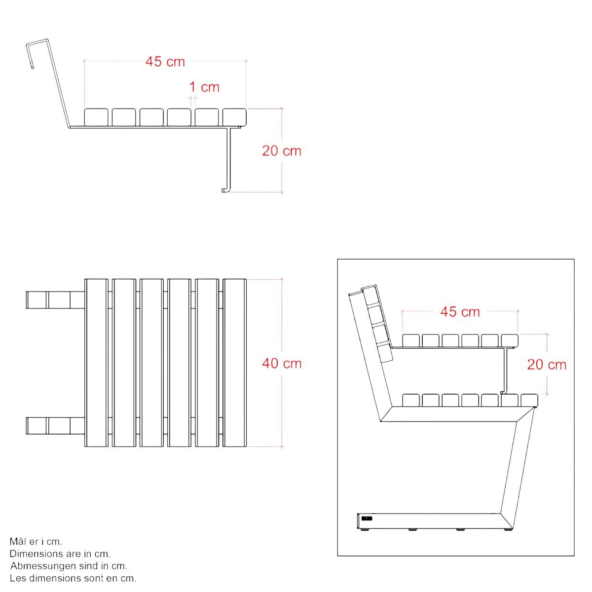 • Fastgørelse: Bænken kan fastmonteres med M8 bolte eller skruer (købes separat afhængigt af underlag, f.eks. fliser, beton eller træ).