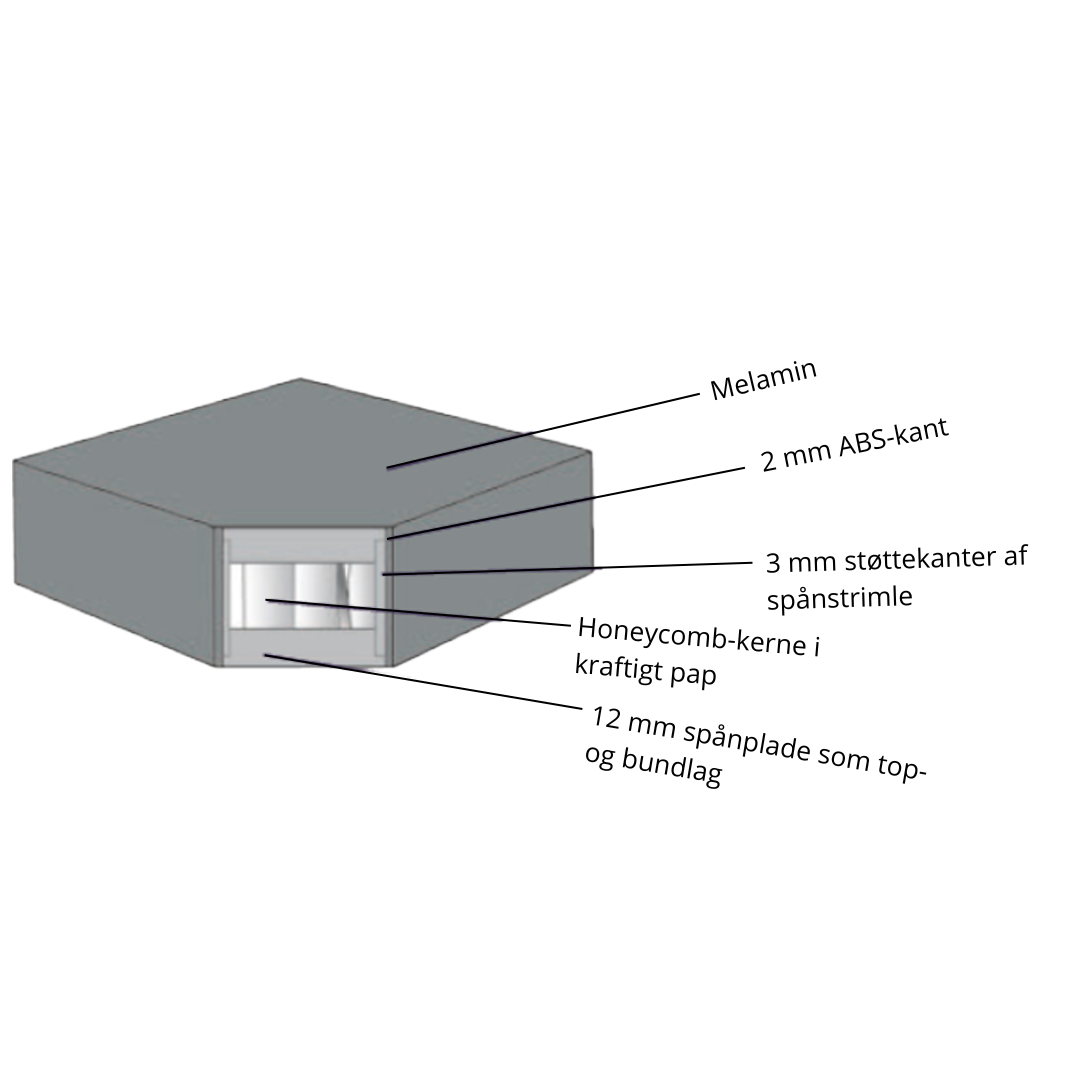 - 3 mm støttekanter af spånstrimler: Lige inden under overfladen ligger en støtteopbygning af miljøvenlige spånstrimler, som styrker konstruktionen og giver bedre holdbarhed.