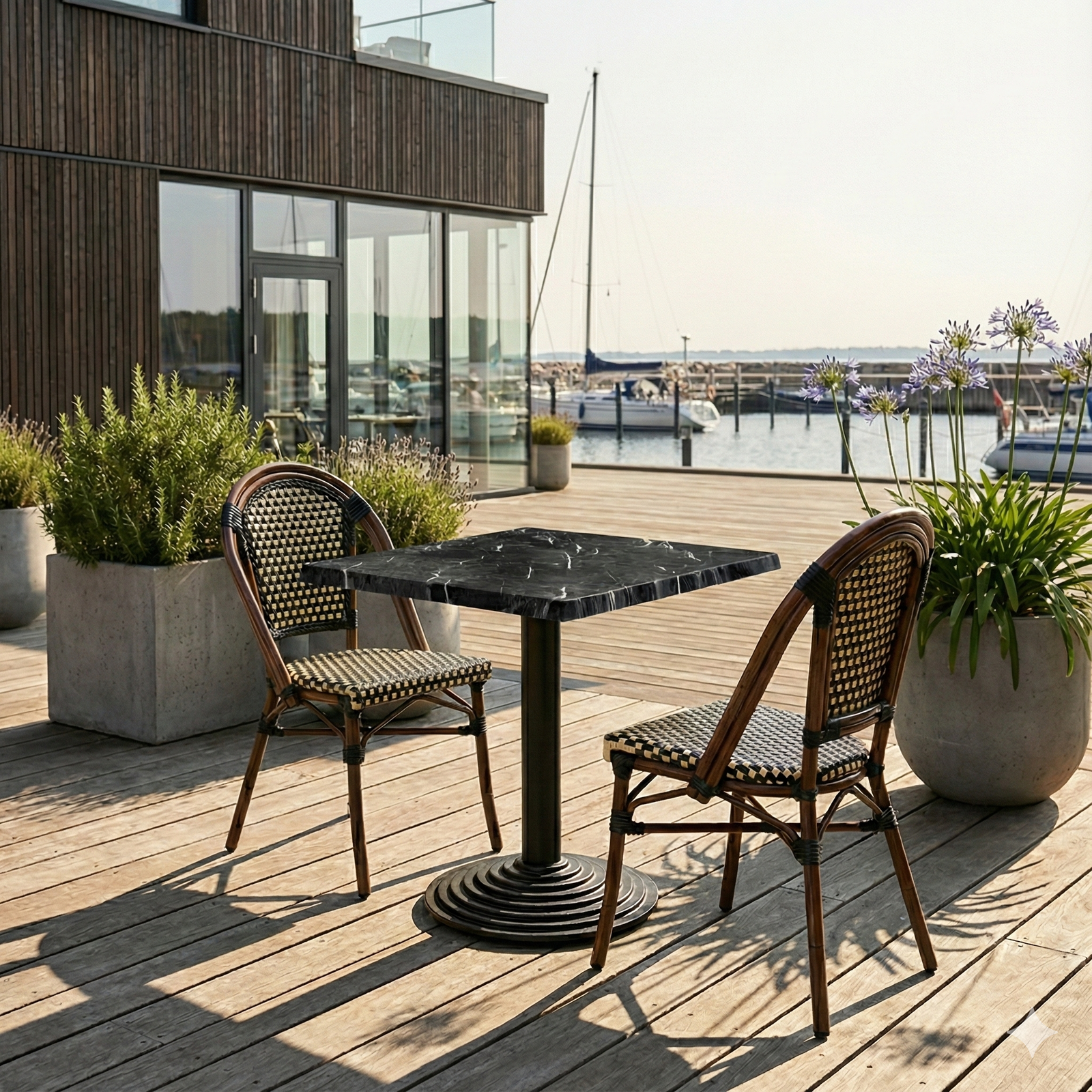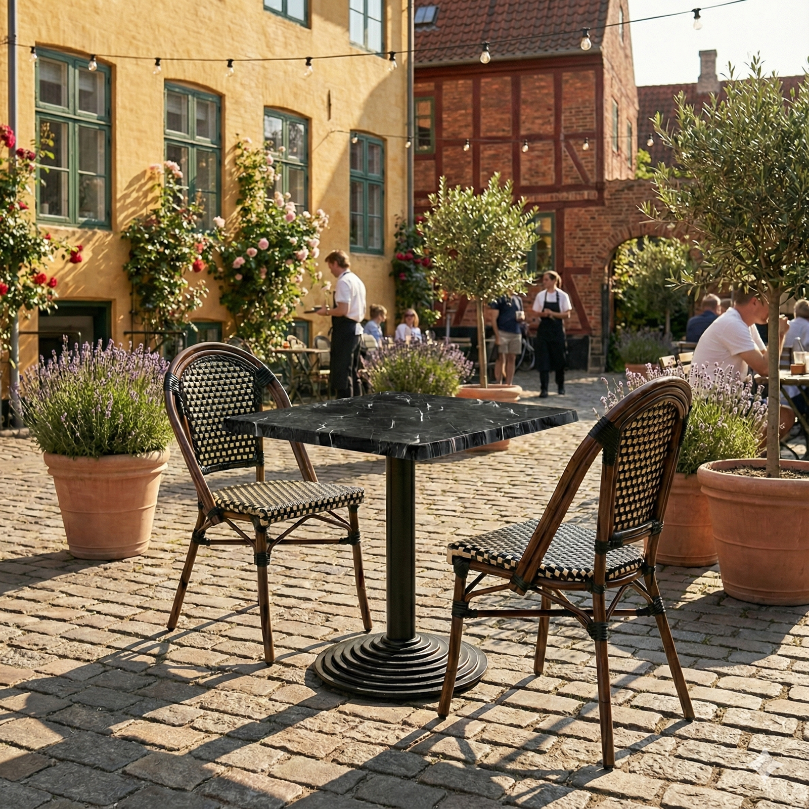 Den firkantede form gør bordpladen velegnet til effektiv udnyttelse af pladsen og fleksible bordopstillinger, både indendørs og udendørs. Et oplagt valg for professionelle, der ønsker et eksklusivt marmorlook kombineret med lang levetid og høj funktionalitet.