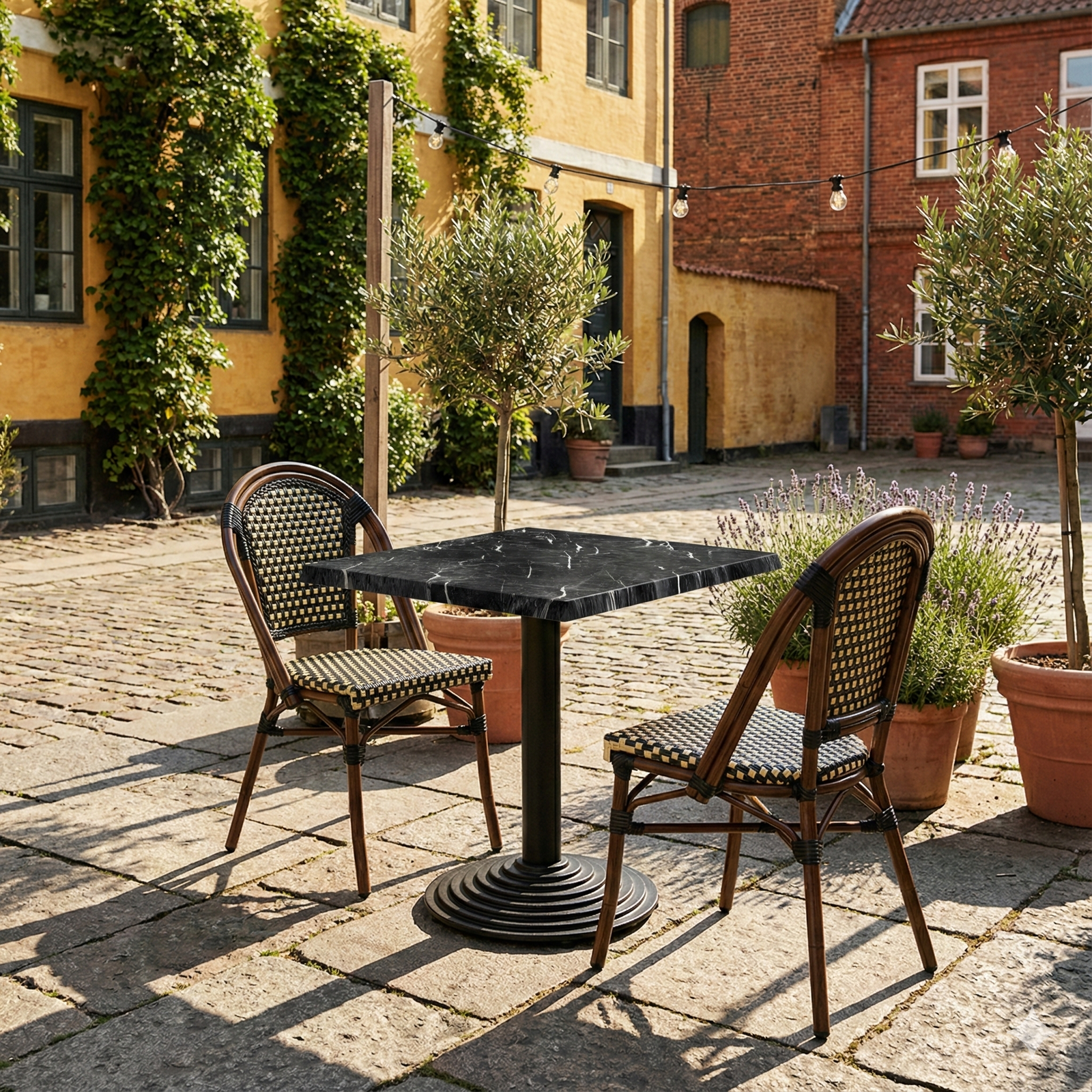 Denne firkantede Teramo bordplade i mørkt marmorlook er et eksklusivt og markant valg til caféer, restauranter, hoteller, kantiner og loungeområder, hvor design og robusthed skal gå hånd i hånd. Det dybe, sorte marmorudtryk med lyse årer tilfører rummet karakter og et luksuriøst præg, som fungerer særligt godt i moderne og kontrastfyldte indretninger.