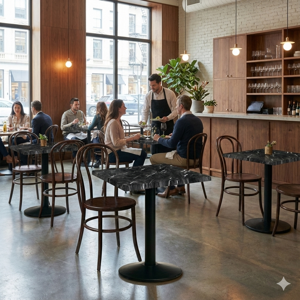 Bordpladen er fremstillet i varmepresset laminat og udviklet til intensiv erhvervsbrug. Overfladen giver marmorens visuelle udtryk, men med laminatens praktiske fordele: høj slidstyrke, modstandsdygtighed over for fugt og pletter samt nem rengøring i daglig drift. Det sikrer en driftssikker løsning med lav vedligeholdelse – også i miljøer med høj gæstebelastning.